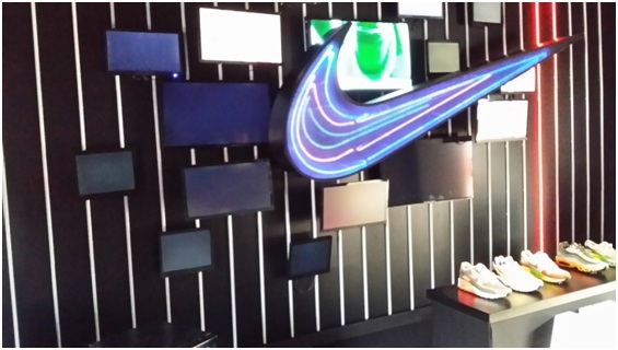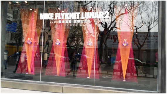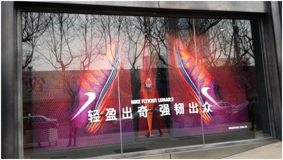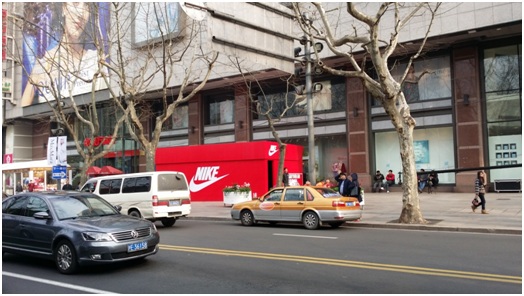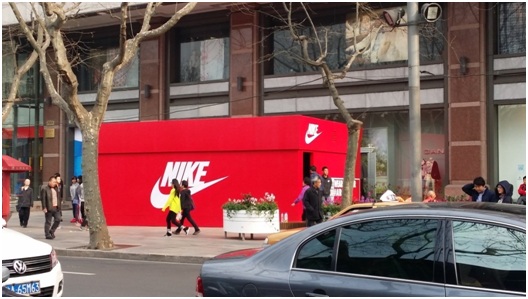 近期,上海淮海路突现硕大“红色耐克鞋盒”格外抢眼,勾起了路人的好奇与兴趣。走进发现,鞋盒侧面还有个门,里面是一个精心布置好的耐克展台,展台上摆放着Nike Sportswear 全新推出的Nike Air Max Breathe系列运动鞋。创意鞋盒不远处,便是耐克旗舰店,橱窗内“轻盈出奇 强忍出众”的Nike Flyknit Lunar 2 跑鞋广告视觉冲击力极强,极易引起路人注意。据悉,此款跑鞋于2014年1月19日上市,并从2014年2月15日起在大陆、香港、台湾地区精选零售店以及Nike.com线上商城发售。该橱窗广告与鞋盒创意广告交相呼应,有效传达了耐克新款产品的信息,同时也起到了刺激销售、方便购买的作用。