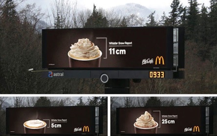 在通往加拿大滑雪胜地惠斯勒的路上,麦当劳做了这样一个户外广告牌:一杯普通的咖啡,上面的奶泡标注了高度——但这并不是奶泡的高度,而是根据当时的降雪量数据实时同步而来。