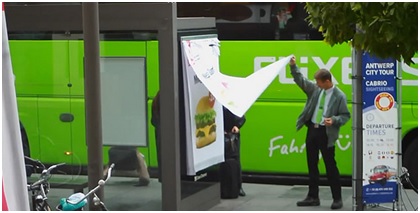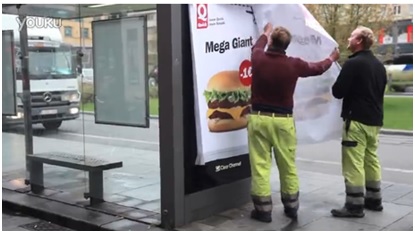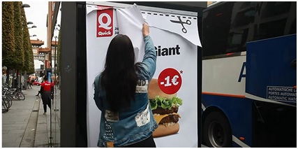 法国餐厅Quick为推广自家的超大汉堡,于是在户外投放了一张既可以当海报又可以当优惠券的大型广告。这些优惠券主要投放于公交车站牌上,用户可以把广告牌撕下来,然后拿到就近的Quick门店,可以在购买此款汉堡的时候便宜一欧元 (通常一个汉堡3 4欧左右)。
