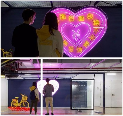 停车场是换车欲的天然温床。汽车金融平台“弹个车”最近在停车场办了一场小说展。地点在上海某个停车场的B3层,整个暗色调的空间被分隔成了不同的小说章节,用亮色装置和钢丝霓虹灯衬托每章的主题。小说讲述了一个普通汽车销售经历了校园恋爱、与老友攀比、老家亲戚麻烦他办事等生活经历——每个章节中,车都扮演了颇为重要的角色,试图激发人们换台车的欲望。