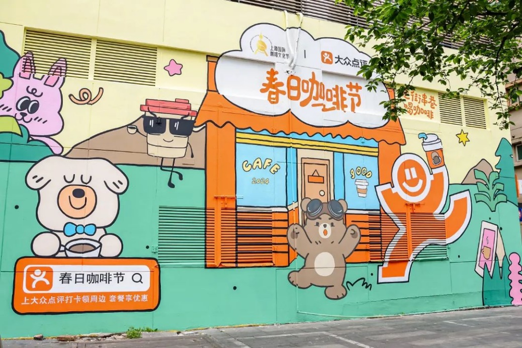可爱的墙绘吸引了许多游客拍照打卡,更有咖啡爱好者慕名而来,与这幅可爱的作品合影。不止是大学路,永康路、武康庭、永乐汇多个热门街区的墙面,也都通过涂鸦换上了春日咖啡节的“限定新装”。