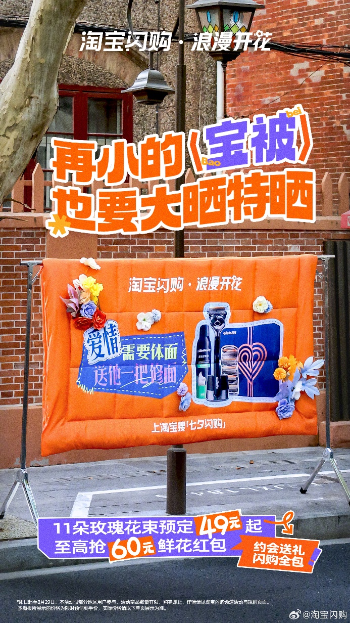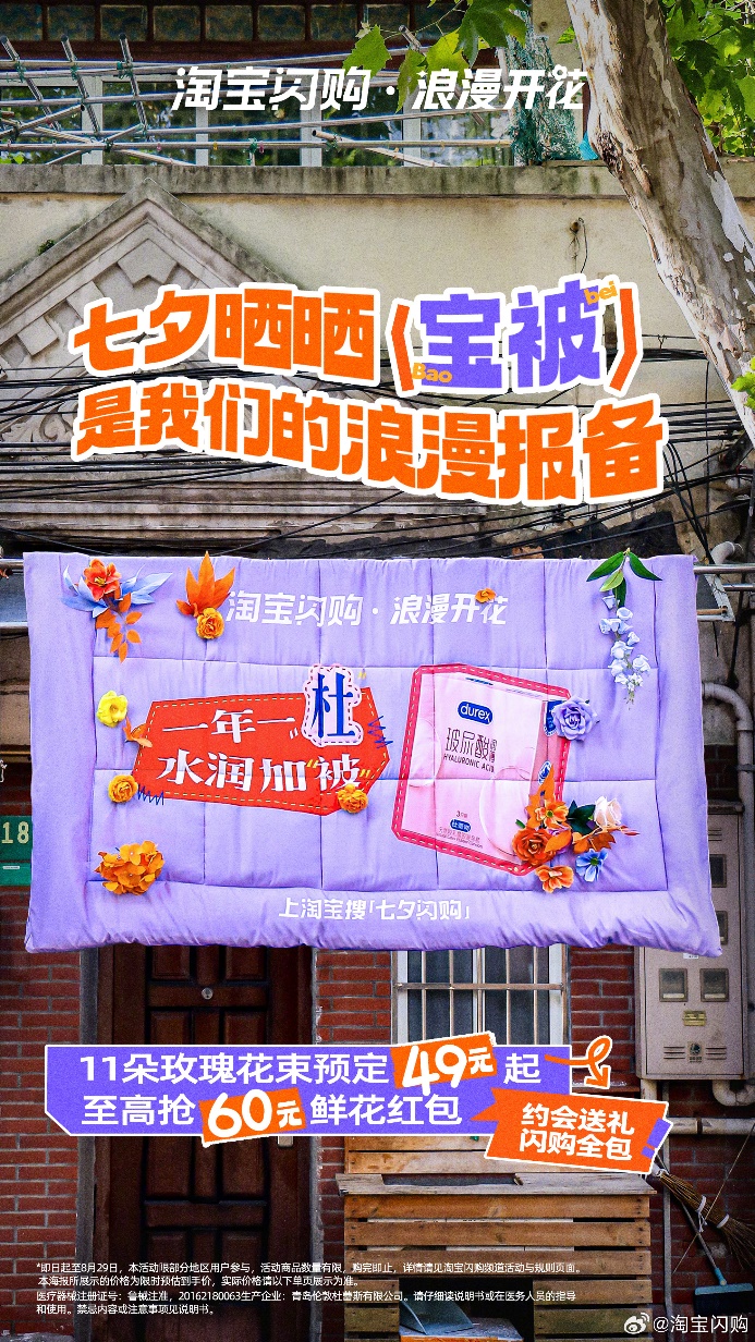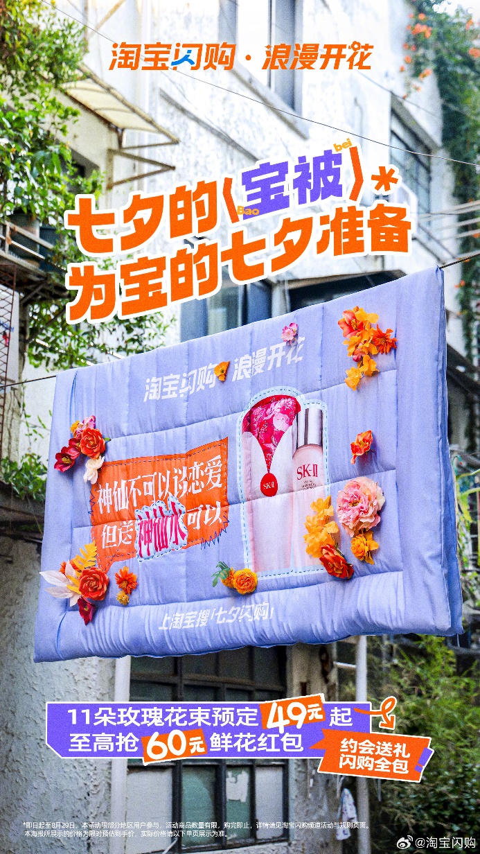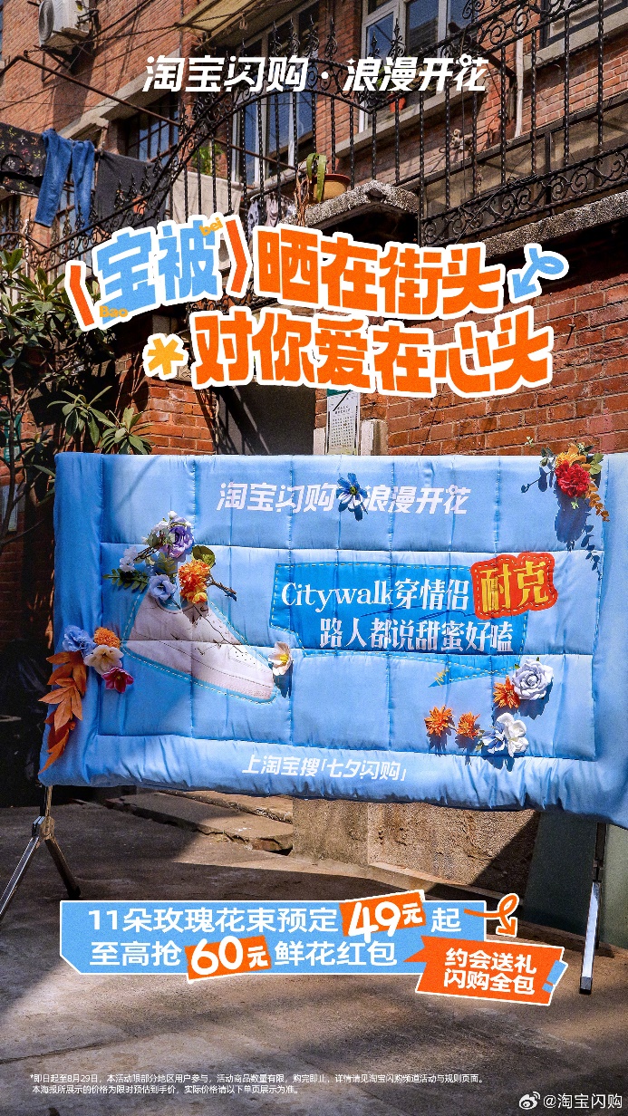 七夕到来之际,淘宝闪购发起「浪漫开花」campaign,鼓励用户在社交平台晒出自己收到或送出的礼物,象征用淘宝闪购的好物包裹心意,如同一床温暖的「被子」般贴心。同时,淘宝闪购也用「宝被」具象化了这一主题,在上海街头「晒宝被」,将七夕礼品缝制在巨型被子装置上,各种晒。