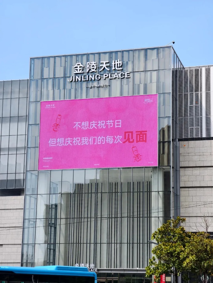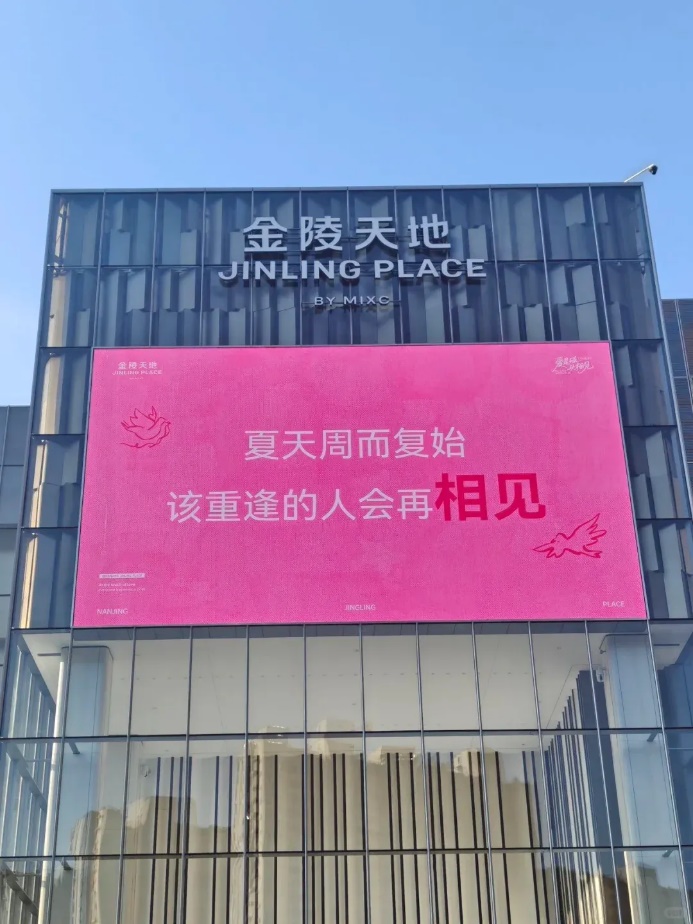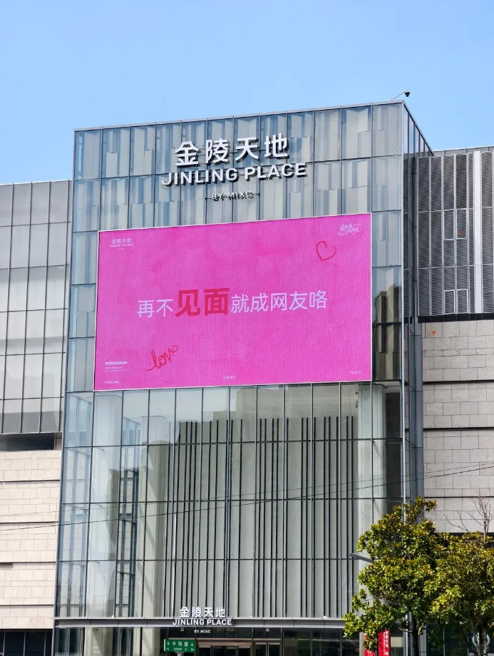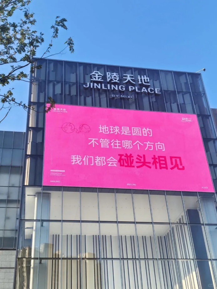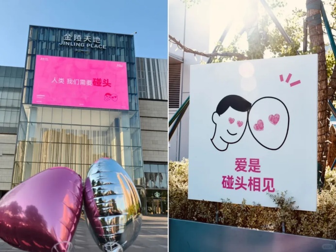 这组大屏广告,其实是南京金陵天地在七夕节策划的「爱是碰头相见」营销活动。