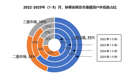 历年来,快餐连锁品牌始终以一二级市场投放为主,但三级市场呈现快速复苏回暖状态。2025年1-5月,快餐连锁品牌在一级市场占比达55%,与2024年同期相比减少10%,二级市场投放占比26%,同比增长2%,三级市场占比19%,同比增长8%。
