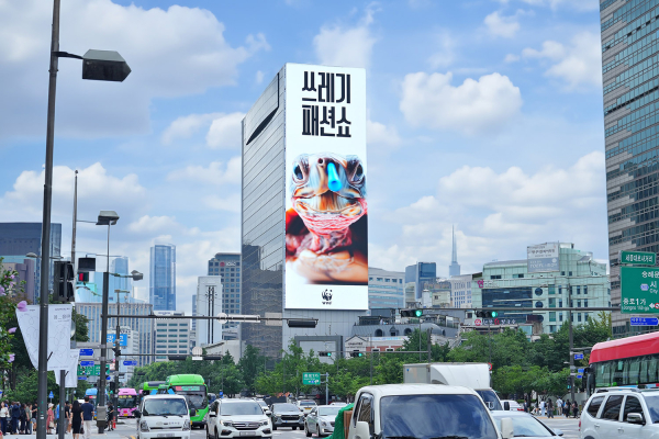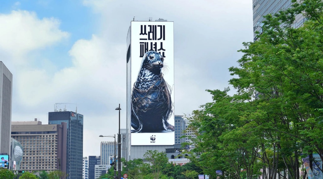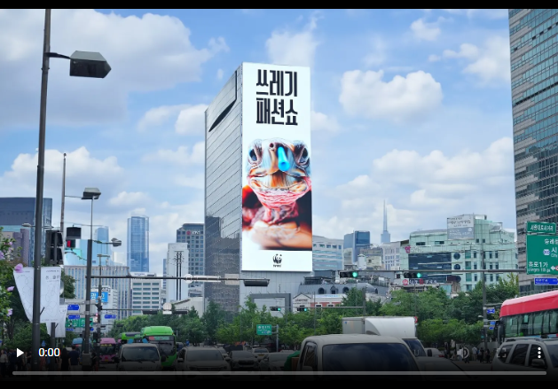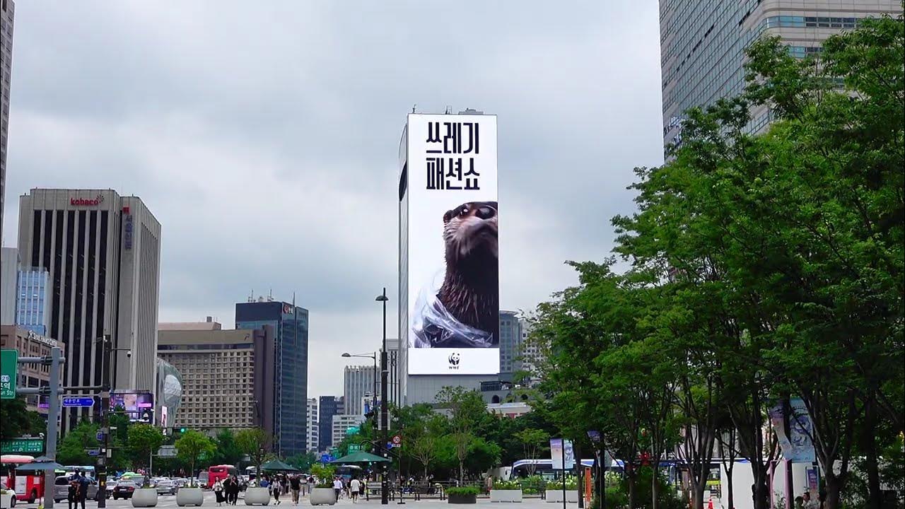 WWF韩国分会在首尔光化门点亮了一块20米 x 60米的巨型视频广告牌,推出一支名为 《ANIMAL TRASH FASHION动物的“垃圾时尚秀”》 的AI无声短片,直面塑料污染对动物造成的伤害。