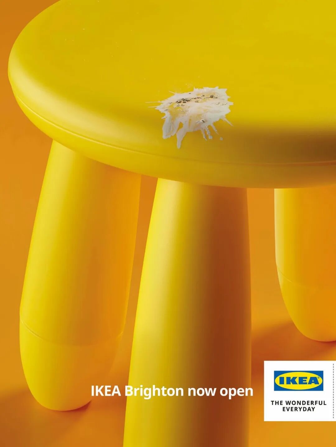 海报以色彩明亮的家具为主体,在上面印制逼真的海鸥粪便图案,搭配上简单直接的文案“IKEA Brighton now open”。