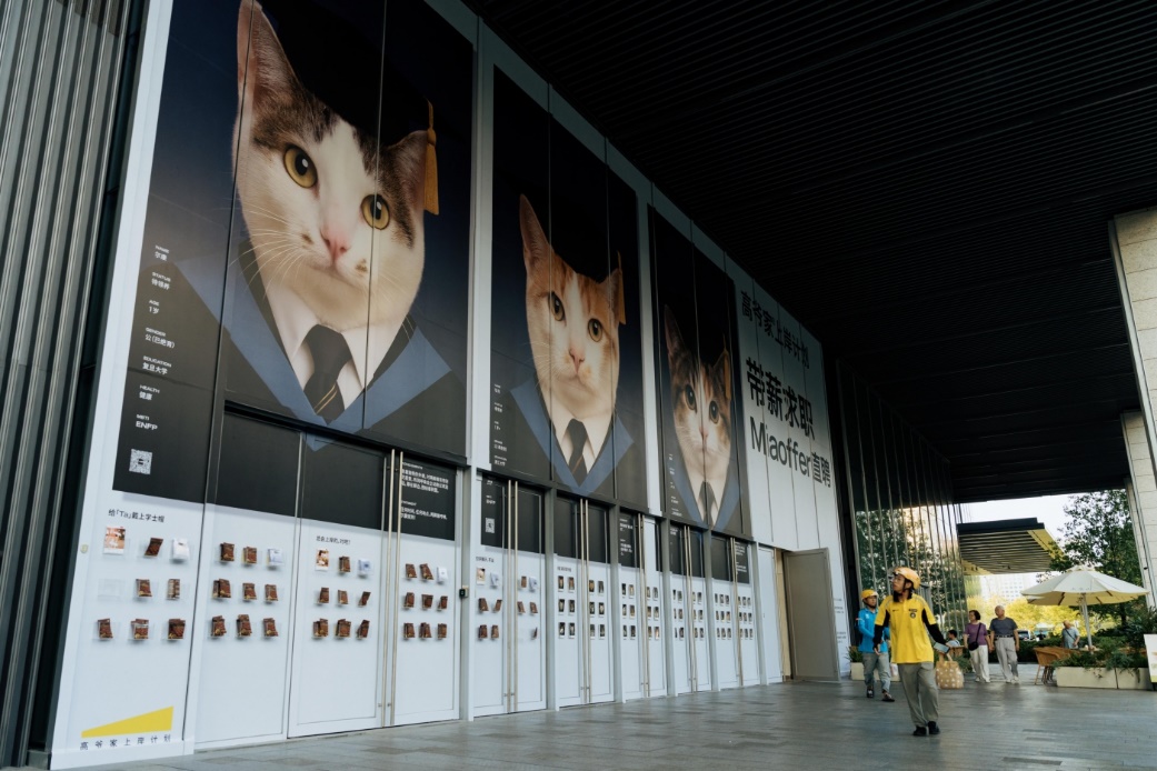 在杭州核心商业中心的高档商场出现的巨型猫咪求职海报,搭配“带薪求职 Miaoffer直聘”文字,以极具视觉冲击力的形式,让一向被选择性忽视的Ta们,这一次能被真正看见。