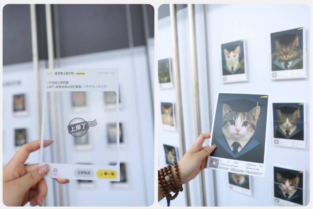 巨幅海报的下半部分设有互动区,约5000份印有待领养猫咪信息的特制简历卡和特制透卡被悬挂在墙面上。