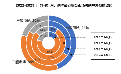 历年来,调味品行业的市场争夺呈现出显著的“聚焦化”趋势。2025年1-8月,行业的营销主战场已明确转向一级市场,其投放占比高达44%,较2022年激增29个百分点。与之形成鲜明对比的是,二级市场占比大幅收缩30%,三级市场则基本持平。这一增一减,清晰地揭示了行业竞争重心的转移:头部品牌正将资源集中于价值高地,在一线市场展开激烈争夺,市场格局从“全面铺开”转向“重点攻坚”。