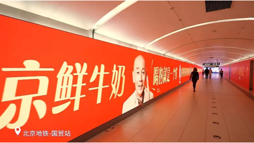 地铁广告延续了《葛优和他的甲方》的风格,以葛优标志性的光头作为焦点,搭配 “北京鲜牛奶,喝的就是一个鲜” 。此外,画面采用高饱和度红色背景和密集排列的“鲜” 字,在封闭的地铁通道内,形成强烈的视觉冲击。