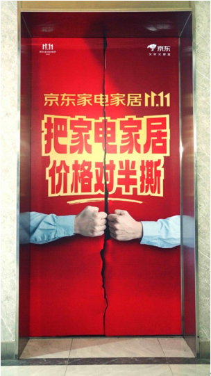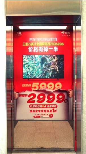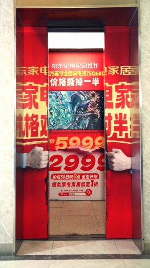 其次,巧妙利用电梯空间,将开门与关门的瞬间打造为一场「撕价」小剧场,融入用户日常动线;