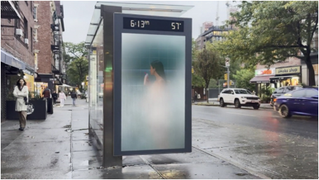 下班路上的人们惊讶地发现,有人正在雾蒙蒙的广告牌里洗澡。