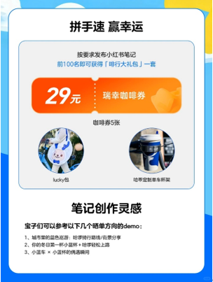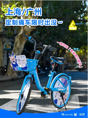 即日起,这些定制单车被投放至上海与广州两城,用户打开哈啰 app 扫码骑行并下单瑞幸,还有机会免费骑哈啰单车。与此同时,哈啰在小红书开启笔记征集活动,用户分享自己的「幸运啡行瞬间」,即有机会获得「瑞幸咖啡券+lucky包+定制车杯架」的惊喜好礼。