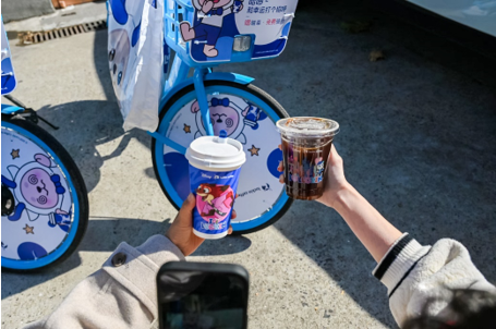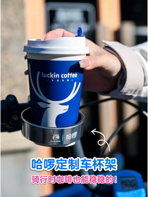 此次联名单车,哈啰在车轮部分绘制上了瑞幸吉祥物lucky的形象,秒变街头显眼包;同时关注到大家在骑行时不便携带咖啡的痛点,品牌在车把手上特别定制车杯架,即使骑行时咖啡也能稳稳当当不洒一滴。