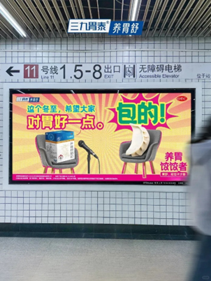 最近冬至,三九胃泰的抽象地铁广告又上新了,给在地铁里的过路人送上一份温暖的关怀。过节的仪式感是饺子给的,吃饺子的快乐是好胃给的。