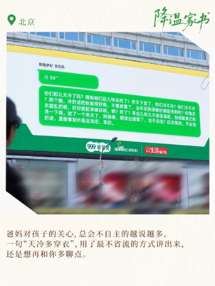 同时,在当天999感冒灵把降温关心制作成了一支特别的视频版降温家书,由来自全国的多位真实爸爸妈妈参与,借助不同家乡的方言,让降温家书有了真实可感的温度。