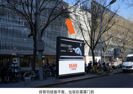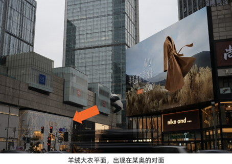为快速建立 B 端采购信任,1688 将广告直接置于奢侈品主场旁——在成都春熙路 DIOR 与爱马仕对面,竖起「专柜品质,克拉自由,价格 1499/克拉」的培育钻广告;在上海金鹰 Loro Piana 与 Burberry 对面,以「小心!羊毛出在羊身上」的双关语呈现羊绒大衣,用「贴脸开大」的方式自信传递品质与价格的反差。