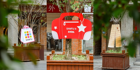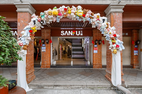 不仅如此,为了贴合泉州在地的“簪花氛围”,我们也给三福门店整了个新“花”型——用玩偶公仔做了个簪娃拱门,每一个来到门店的人都能体验到福气的“天花板”。