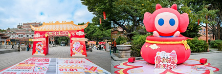 极具庙会特色的大拱门,换上了新年皮肤的小福龙来欢喜坐镇。