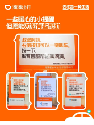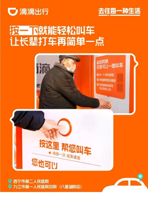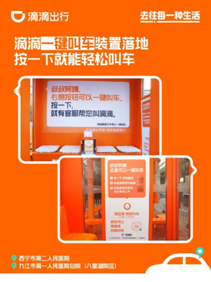 在西宁和九江医院门口,滴滴在暖心车站落地了一键叫车装置,长辈只需要轻轻一按,就能接通电话叫车专属客服,帮助叫车,无需面对复杂的手机操作,真正实现「化繁为简」。