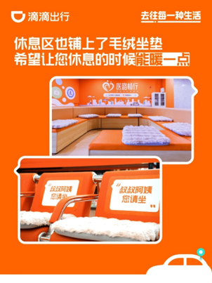 为了让等候区更温暖,滴滴给暖心车站的座椅都加上了厚实的垫子,给候车厅穿上了暖呼呼套装,让长辈就医环境舒服一点、温暖一点。同时,滴滴还设置了志愿者服务点,为有需要的长辈提供指引。站点还准备了口罩、便携取药袋等小物品,定制取药袋可方便长辈收纳琐碎的票据和药品,贴心口罩则为长辈健康多添一层守护。