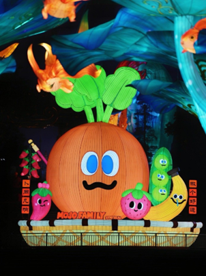 灯组由 MOJO FAMILY 核心成员「魔魔胡胡胡萝卜」领衔,与好朋友「四处流香香蕉哥」、「羞羞答答小草莓」、「我不转豌豌豆三兄弟」共同化身「光影寻味官」,在璀璨灯影中邂逅川渝的灵魂风物——「心甜手辣小辣椒」。