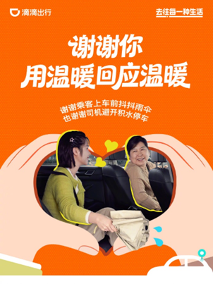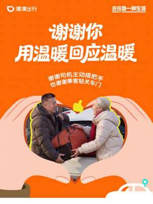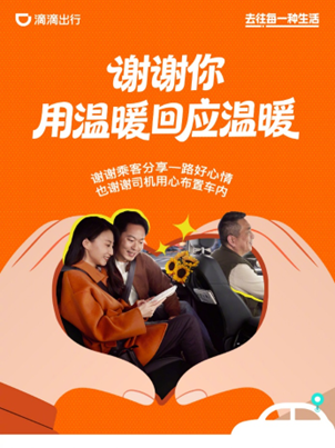 「谢谢你,用温暖回应温暖」找到品牌、司机、乘客之间的情感连接点,让温暖成为各方共同的价值追求。滴滴用持续的谢谢,致敬司乘之间的闪光温暖时刻,也致谢每一位温暖的司机和乘客。