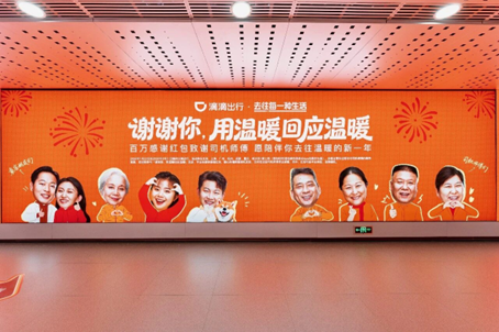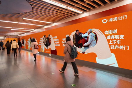 系列海报投放在北京、杭州的换乘通道,打造出沉浸式感谢回廊。沿着行人动线,将司乘间的温暖瞬间与真挚原话铺满两侧,让每一位步履匆匆的过客,都能短暂走进那段双向奔赴的温情旅程。