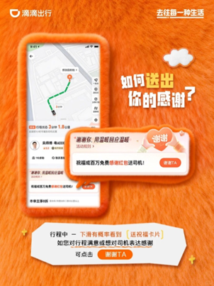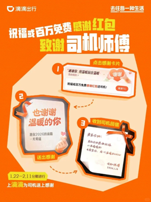 同时平台也在新年之际,向温暖的司机和乘客致谢,滴滴 App 内部分城市同步上线「百万感谢红包致谢司机师傅」活动,乘客可在行程中后给司机送去红包或祝福,红包由平台出资。让平台的温暖不仅停留在情感层面,更落地为对司机群体的真切关怀,司机收到祝福或红包后,也能意见回应乘客,实现善意的流动和循环。