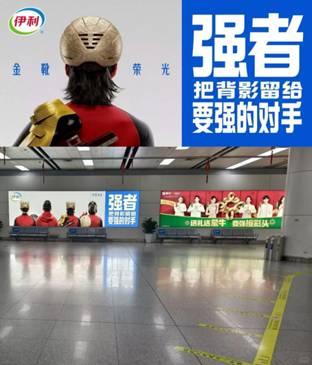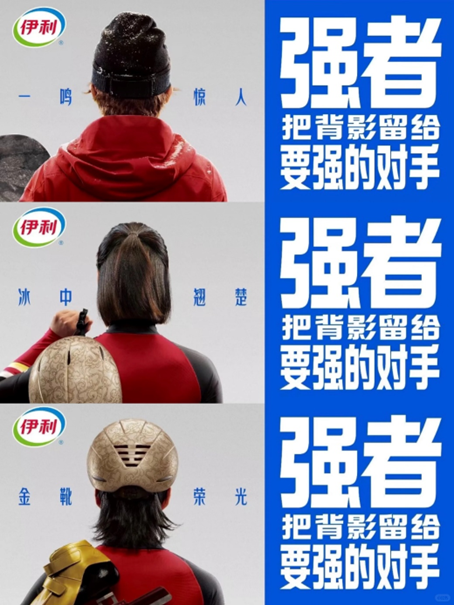 近日,就有不少网友在呼和浩特机场内,发现了一幅和传统印象中完全不一样的伊利海报。海报并未露出出镜人员的正脸,而是以背影和她们的装备来暗示自己的身份,配以「强者,把背影留给要强」的对手文案,与旁边蒙牛六位代言人正脸出镜的海报形成了鲜明对比。有趣的是,「营养世界每个人的要强」是蒙牛的广告语,「要强」也是其品牌主张,而伊利的文案巧妙的呼应了赛场上强者遥遥领先留给对手背影的事实,还为即将官宣的四位奥运健将代言人蒙上了一层神秘的面纱。