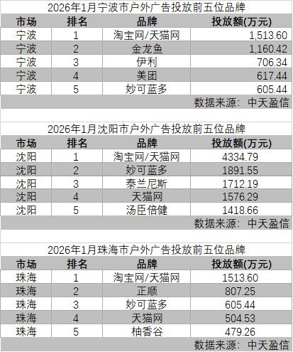 26年1月部分城市前五位品牌