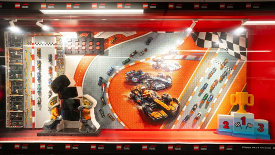 其中最吸睛的当属一面巨型乐高积木拼图橱窗,由 55 万块积木、260 个乐高人仔与 30 辆乐高 F1 赛车拼搭而成,耗时 930 小时精心打造,还原赛事中发车起步、弯道超车、冲线争冠的名场面。