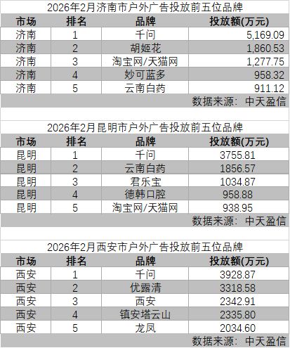 26年2月部分城市前五位品牌