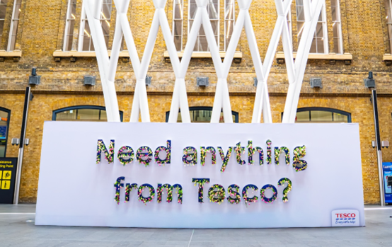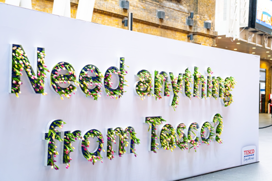 在英国母亲节(通常在三月)前夕,零售巨头Tesco将国王十字车站的广告牌改造成一个巨大的自采花展,邀请通勤者在母亲节前直接从海报上摘取新鲜郁金香。