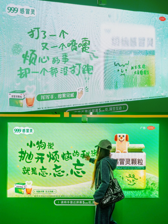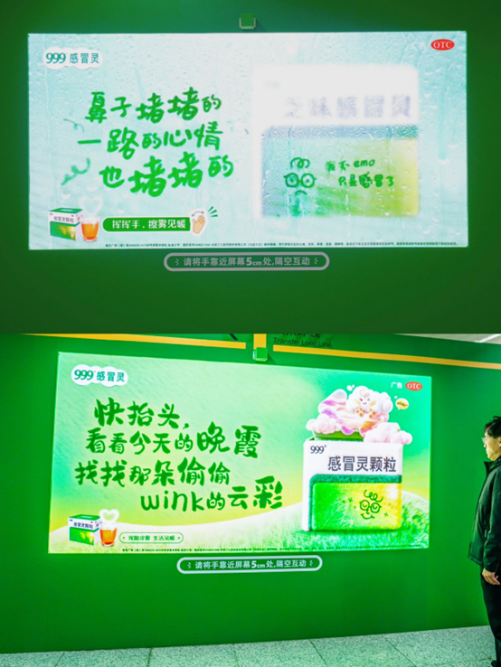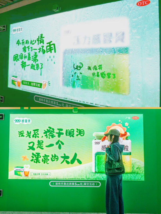 洞察到这一社会情绪,近日,999 感冒灵在重庆地铁奥体中心站打造了一场极具创意的互动广告,以一面可「擦」的雾面广告灯箱,将都市人常见的「情绪感冒」搬进公共空间。
