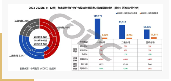 根据CODC此前发布的《2025年户外广告市场投放分析报告》显示,“各市场级别广告投放特点中,一级市场依然是户外广告的绝对主力,占45%以上份额,且广告花费和品牌数量增幅均处于前列;二级市场广告花费保持温和增长趋势,但份额逐年缩减,且收缩幅度趋缓;三级市场份额保持稳定,广告花费温和增长,但品牌数量规模最高,品牌价值较低。”