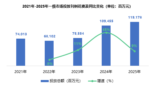 2021-2025年,一级市场户外广告投放规模持续扩大,从2021年的740亿元上升至2025年的近1200亿元。虽在2022年出现小幅回调,但2023年便由降转增,此后连续三年保持增长态势;2024年增速达到峰值45%,投放总额也达到惊人的近1100亿元;2025年增速有所下降,但仍然保持增长态势,市场进入稳健发展阶段。这一趋势既体现了一级市场在外部冲击下的韧性,也反映了宏观经济与消费复苏的节奏。
