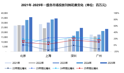 整体而言,北京和上海投放规模优势稳固,深圳和广州虽增长势头强劲,均未形成结构性赶超,市场分布情况未见根本改变。