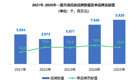 品牌数量层面,受外部环境影响一级市场在2022年短暂下滑后持续回升,2025年整体达到五年峰值8929个。单品牌贡献值从2021年的1240万元波动增长至1330万元,过程虽跌宕起伏,但起落幅度较小,总体保持平稳。