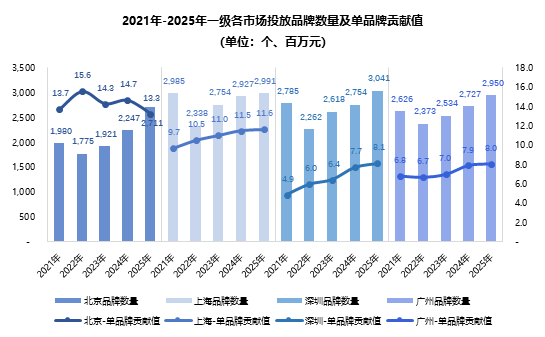 但在单品牌贡献值方面,四城呈现出明显的差异性。2025年数据显示,北京单品牌贡献值高达1330万,领跑一级市场;上海1160万紧随其后;深圳和广州均在800万左右,二者表现更为接近。可见北京和上海的品牌贡献值显著领先,深圳和广州则处于同一量级区间。