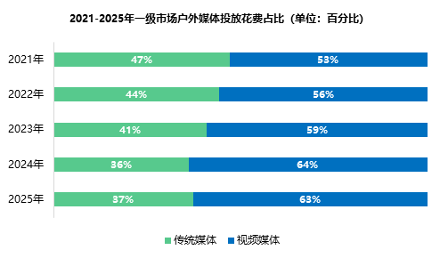 过去五年,一级市场户外媒体投放结构持续分化,投放重心进一步向视频媒体倾斜。2021年视频媒体占比为53%,已略高于传统媒体,此后二者差距逐年拉大。2021年-2024年传统媒体占比持续下降,尽管2025年出现小幅回升1个百分点,但整体仍处于弱势格局。同期,视频媒体始终占据主导地位,投放占比逐年提升,进一步成为一级市场户外广告投放的核心。