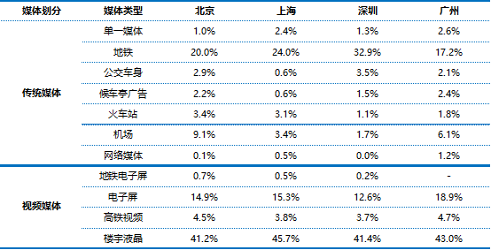 从2025具体数据来看,一级市场各市场投放偏好十分相似,传统媒体以地铁广告为绝对核心载体,视频媒体则以楼宇液晶广告占据主导地位。
