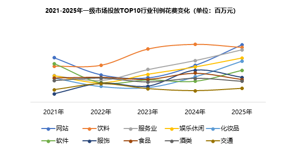 2025一级市场投放刊例花费TOP10品牌中,饮料行业占据三席、网站行业占据两席,其他服饰、软件、电脑及配件、母婴用品、食品、个人用品和服务业各占据一席。TOP10品牌中只有“小猿”投放刊例花费同比上一年有所下降,其他品牌均呈上升态势。