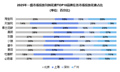 传统媒体中,地铁媒体凭借一线城市庞大、稳定的客流基数,成为各城市首选投放渠道。其中深圳地铁投放占比最高达32.9%;广州地铁投放占比最低为17.2%,但仍为地区传统媒体第一选择。除地铁媒体外,北京机场媒体投放占比9.1%,成为其传统媒体结构中的重要补充,亦印证了机场媒体在头部品牌营销中的战略价值。