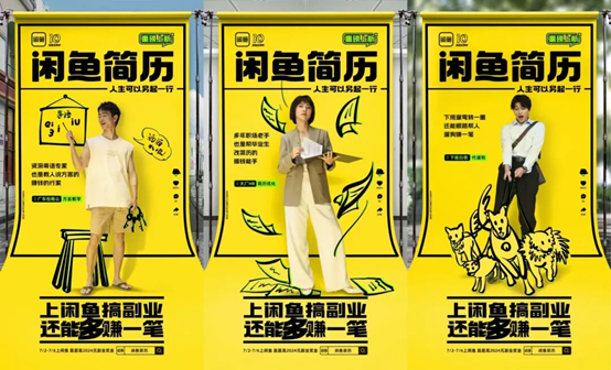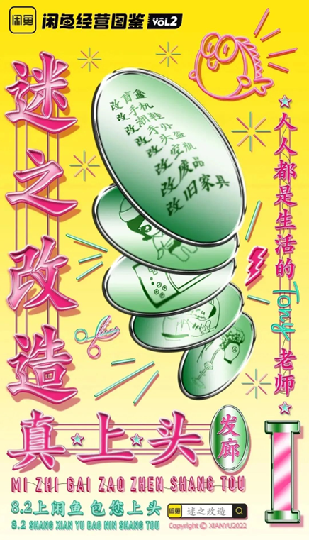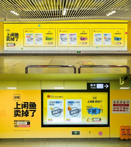 此次设计也延续了闲鱼一贯年轻化、接地气、懂玩梗的品牌调性,与杭州地铁 “卖掉了” 清仓主题、线下 “真上头发廊” 土味海报、副业简历营销等形成创意矩阵,强化品牌 “会玩、敢玩、懂年轻人” 的鲜明形象。